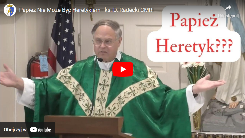 Popularne Co to jest Sedewakantyzm? Sede Vacante admin - 15 kwietnia, 2024 Stanowisko Teologiczne CMRI CMRI admin - 15 kwietnia, 2024 Teologiczne Błędy FSSPX Problemy FSSPX admin - 15 kwietnia, 2024 Czym Jest Zgromadzenie Maryi Niepokalanej Królowej? CMRI admin - 15 kwietnia, 2024 Herezje Soboru Watykańskiego II – Apel do Duchowieństwa Kościół po Soborze admin - 15 kwietnia, 2024 Podobne posty Ostatnie Przesłanie Prawdziwej Siostry Łucji z Fatimy Kościół po Soborze Gdzie Jest Kościół Dzisiaj? – x. Eugen Rissling, Warszawa 14.12.2024r. treści wideo Ostatnie Przesłanie Prawdziwej Siostry Łucji z Fatimy – x.B.Hughes CMRI Kościół po Soborze Duchowa Walka Człowieka z Demonem – Wykład x. Dominic Radecki treści wideo Czy Posoborowe Święcenia są Ważne? – wykład treści wideo Prawdziwi Papieże Potępiają Herezje SW2 treści wideo Papież Nie Może Być Heretykiem – x.D.Radecki CMRI treści wideo Author: admin 28 czerwca, 2024 Less than 1 min.read FacebookTwitterPinterestWhatsApp O tym jak pogodzić nieomylność Kościoła z posoborowymi „papieżami”, dlaczego papież nie może być heretykiem, oraz o głębszym znaczeniu obecnego kryzysu wiary. Ks. Dominic Radecki CMRI Tagspapieżsedewakantyzm Poprzedni artykułJak Rozpoznać Prawdziwy Kościół?Następny artykułKobiety przy ołtarzu: Spojrzenie na Ruch Święceń Kobiet adminhttps://www.cmri.pl Popular Articles Ostatnie Przesłanie Prawdziwej Siostry Łucji z Fatimy Gdzie Jest Kościół Dzisiaj? – x. Eugen Rissling, Warszawa 14.12.2024r. Ostatnie Przesłanie Prawdziwej Siostry Łucji z Fatimy – x.B.Hughes CMRI Duchowa Walka Człowieka z Demonem – Wykład x. Dominic Radecki Czy Posoborowe Święcenia są Ważne? – wykład